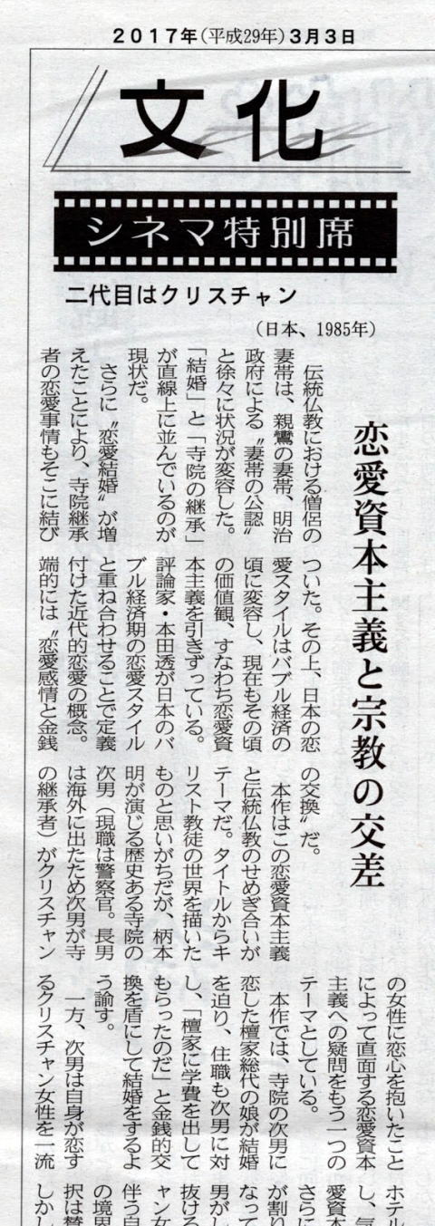2017年3月31日掲載 以下の画像は掲載された 映画コラムの一部を切り取ったものです。 ![]() ![]() もしこのコラムに興味を持ってくださり、 全文お読みいただける方がいらっしゃいましたら 以下のリンクまでお問い合わせください。 中外日報購読案内: http://www.chugainippoh.co.jp/annai/koudoku.html |